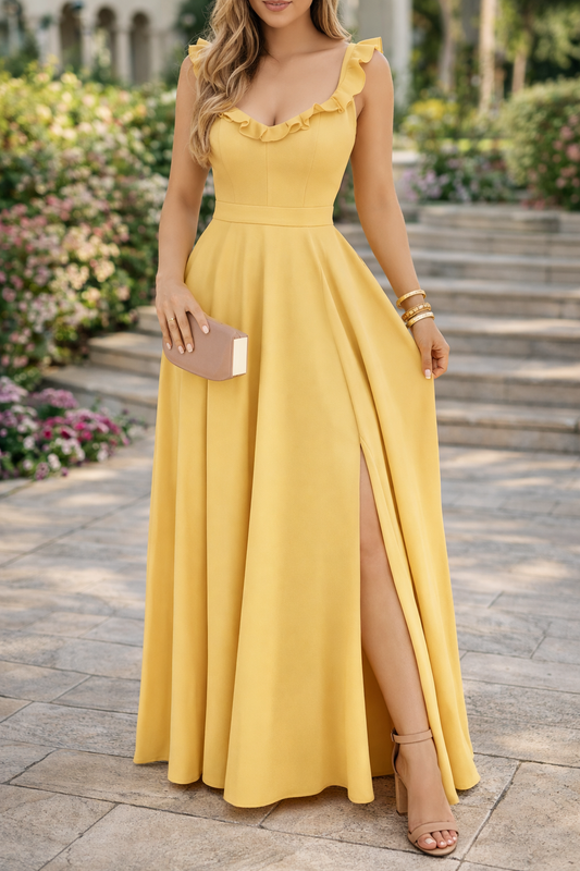 Women's Yellow Polka Dot Maxi Dress Ruffled Neckline Back Tie Side Slit