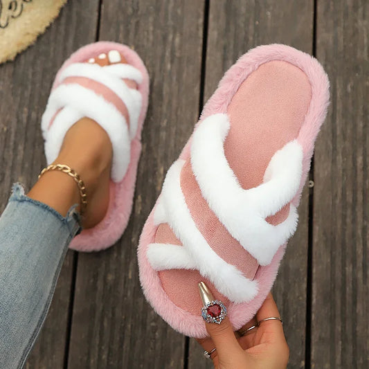 Luxury Faux Fur Cross Strap Slippers Women Winter