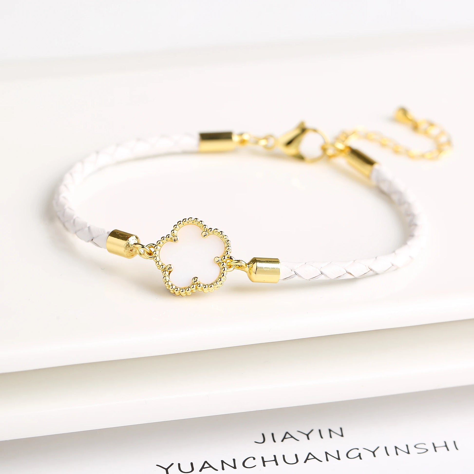 Classic Genuine Leather Woven Natural Stone Five Leaf Flower Charm Bracelet